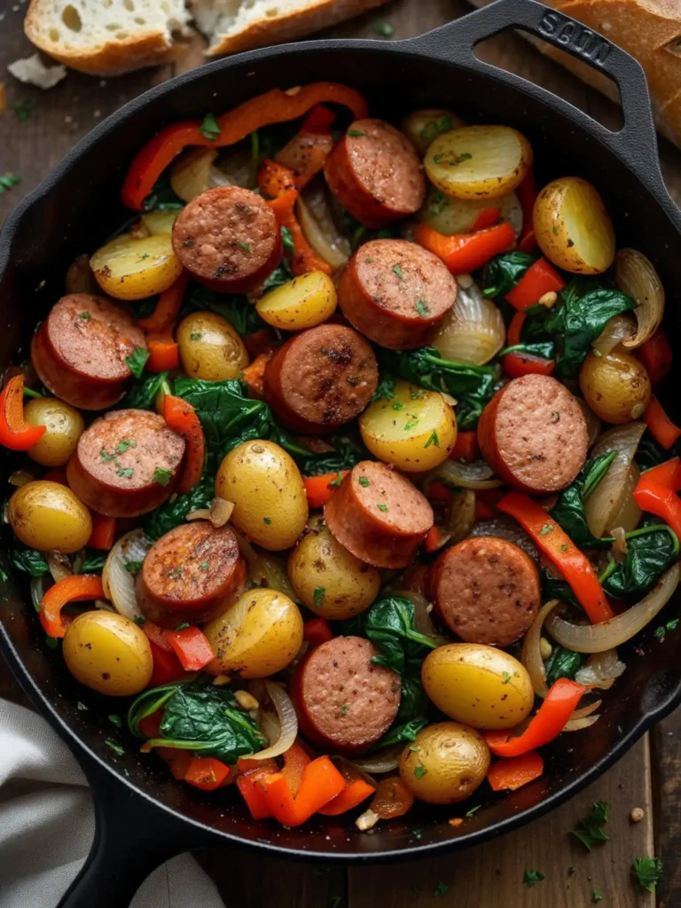 Sausage and Potatoes Skillet is a comforting and versatile one-pan dish that combines savory sausage with crispy potatoes, onions, and bell peppers. It’s an all-in-one meal that’s quick to prepare, perfect for busy weeknights or a weekend brunch. You can use any type of sausage—pork, turkey, or chicken—making it customizable to your tastes.